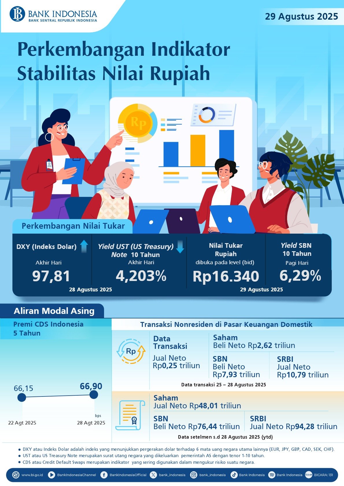 Di sisi lain, indeks dolar AS (DXY) menguat ke level 97,81, sedangkan yield US Treasury Note 10 tahun turun ke level 4,203%. Pada pagi hari Jumat, 29 Agustus 2025, Rupiah dibuka pada level Rp16.340 per dolar AS, dengan yield SBN 10 tahun relatif stabil di level 6,29%.