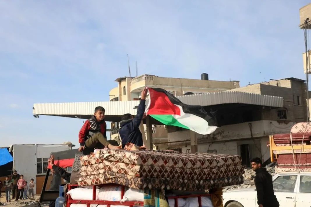 GAZA – Ribuan Warga Palestina pulang ke Kota Rafah di Jalur Gaza selatan pada 19 Januari 2025. Pemandangan itu terlihat sejak kesepakatan gencatan senjata Israel dan Hamas di Gaza mulai diberlakukan pada Minggu (19/1), setelah berbagai serangan mematikan yang berlangsung selama lebih dari 15 bulan.