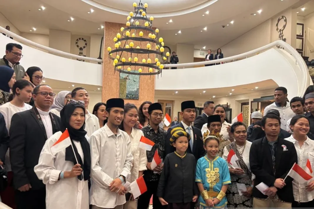 Ketika Gibran memasuki area lobi hotel, puluhan diaspora langsung memberikan ucapan selamat datang serta menyanyikan lagu “Rayuan Pulau Kelapa”.