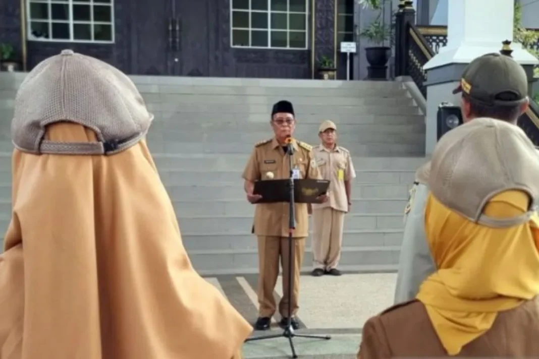Sahbirin Noor tampak mengenakan pakaian dinas untuk memimpin apel aparatur sipil negara (ASN) di halaman Kantor Gubernur Kalsel, Kota Banjarbaru, Senin.