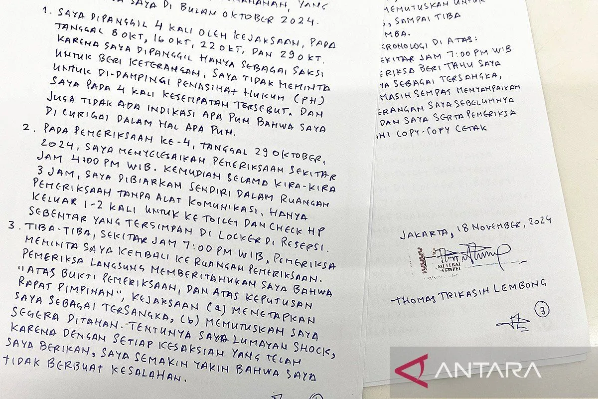 Kemudian, dalam surat kesaksian itu, juga disebutkan Tom telah menjalani pemeriksaan oleh Kejaksaan Agung sebanyak empat kali yakni 8 Oktober, 16 Oktober, 22 Oktober dan 29 Oktober.