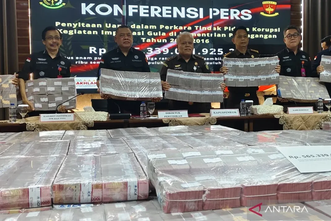 JAKARTA – Kejaksaan Agung (Kejagung) menyita uang senilai Rp565 miliar terkait dengan kasus dugaan korupsi kegiatan importasi gula di Kementerian Perdagangan pada tahun 2015—2016.