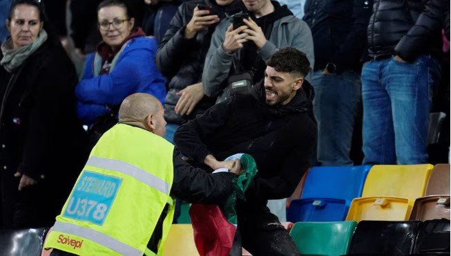 Meski telah tercapai gencatan senjata antara Israel dan Hamas, Committee for Palestine‑Udine tetap berdemonstrasi. Saat malam menjelang pertandingan, protes berubah bentrokan: beberapa peserta melempar petasan dan barikade ke arah polisi anti huru‑huru, sementara aparat merespons dengan meriam air dan gas air mata.