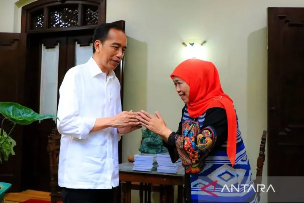 SOLO – Gubernur Jawa Timur Khofifah Indar Parawansa dan Wakil Gubernur Emil Elestianto Dardak bersilaturahmi ke Presiden RI ke-7 Joko Widodo di kediamannya di Surakarta, Jumat (28/2), usai mereka mengikuti kegiatan retret.