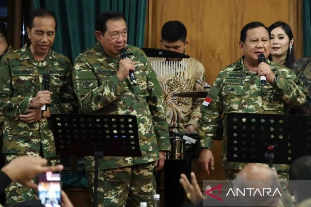 JAKARTA – Presiden RI Prabowo Subianto, Presiden ke-6 RI Susilo Bambang Yudhoyono (SBY), dan Presiden ke-7 RI Joko Widodo (Jokowi) kompak bernyanyi bersama mengenakan seragam loreng Komponen Cadangan TNI.