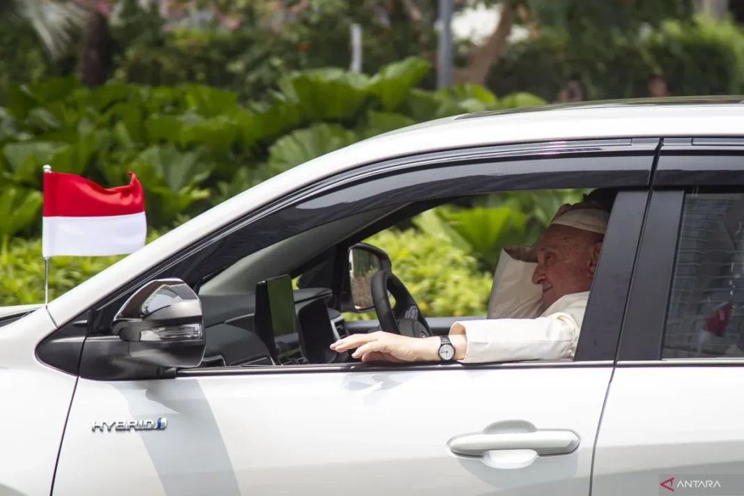 Paus Fransiskus tiba di kompleks Istana Kepresidenan Jakarta sekitar pukul 09.35 WIB menggunakan mobil yang sehari-hari yang cukup banyak digunakan masyarakat Indonesia yakni Toyota Kijang Innova Zenix berwarna putih bernomor polisi SCV 1.