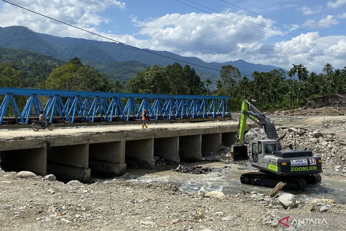 Alat-alat berat itu tampak mengangkat batu dan kayu serta menumpuk fondasi untuk membangun batasan antara jalan dan bibir sungai yang amblas akibat bencana akhir November 2025 lalu.