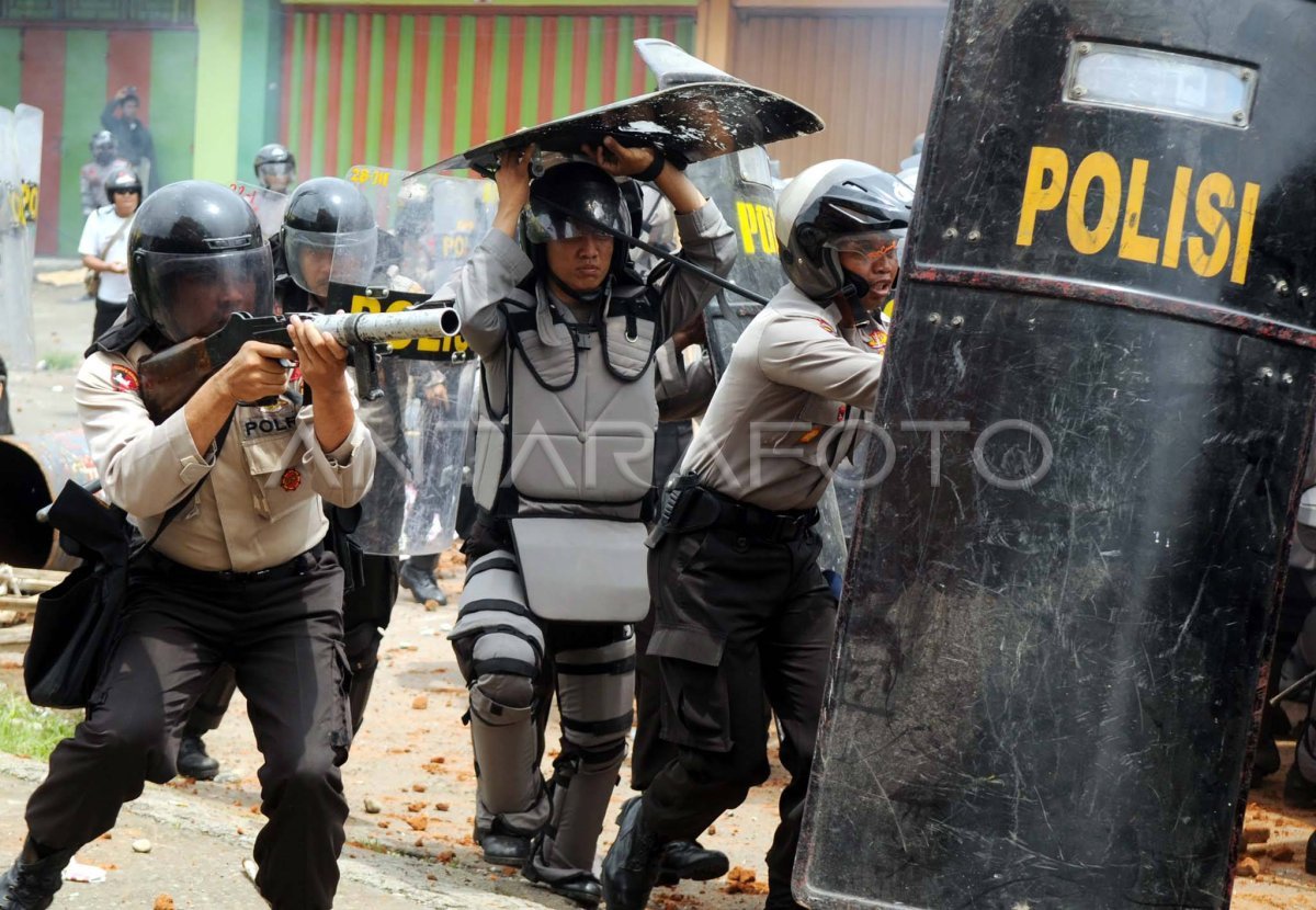 Massa yang terdesak terus mundur perlahan dan meninggalkan lokasi unjuk rasa dengan mencoba melemparkan barang yang ada kepada petugas.