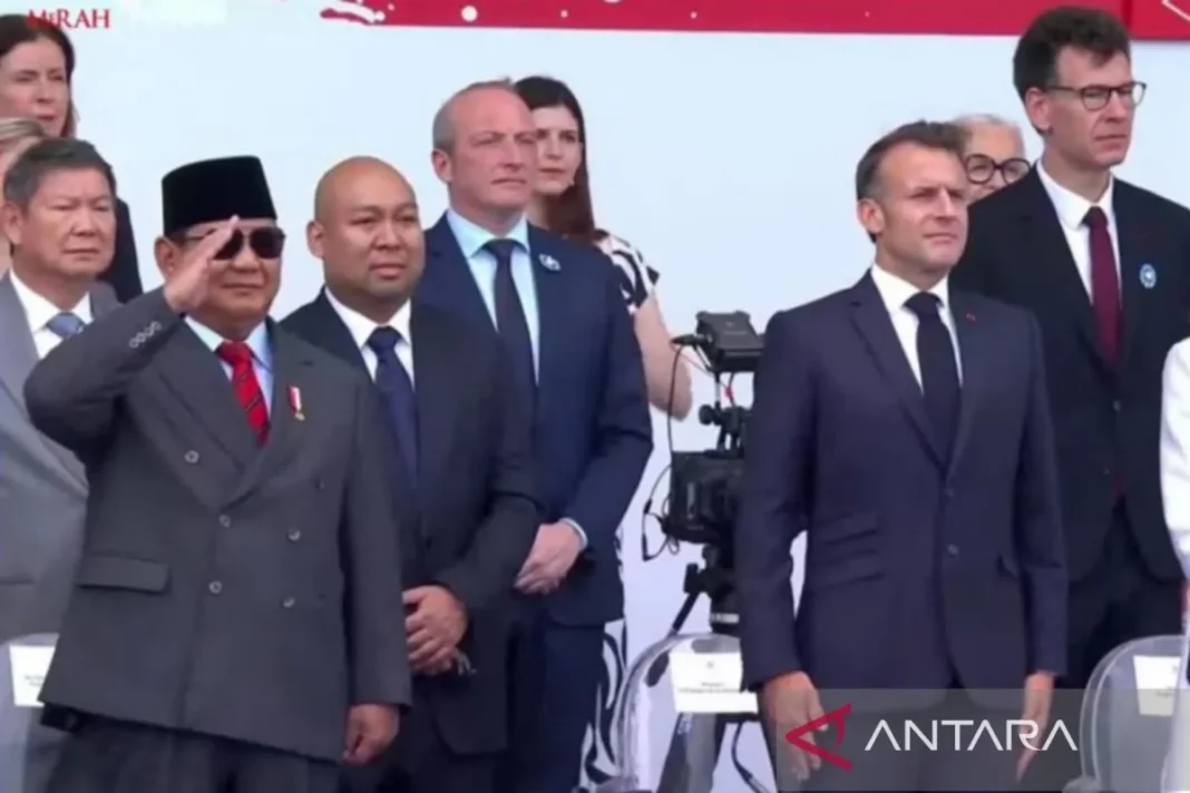 Presiden Prabowo nampak berdiri dan memberikan hormat saat pasukan Indonesia melintas, sementara Presiden Prancis Emmanuel Macron terlihat mengapresiasi dengan tepuk tangan.