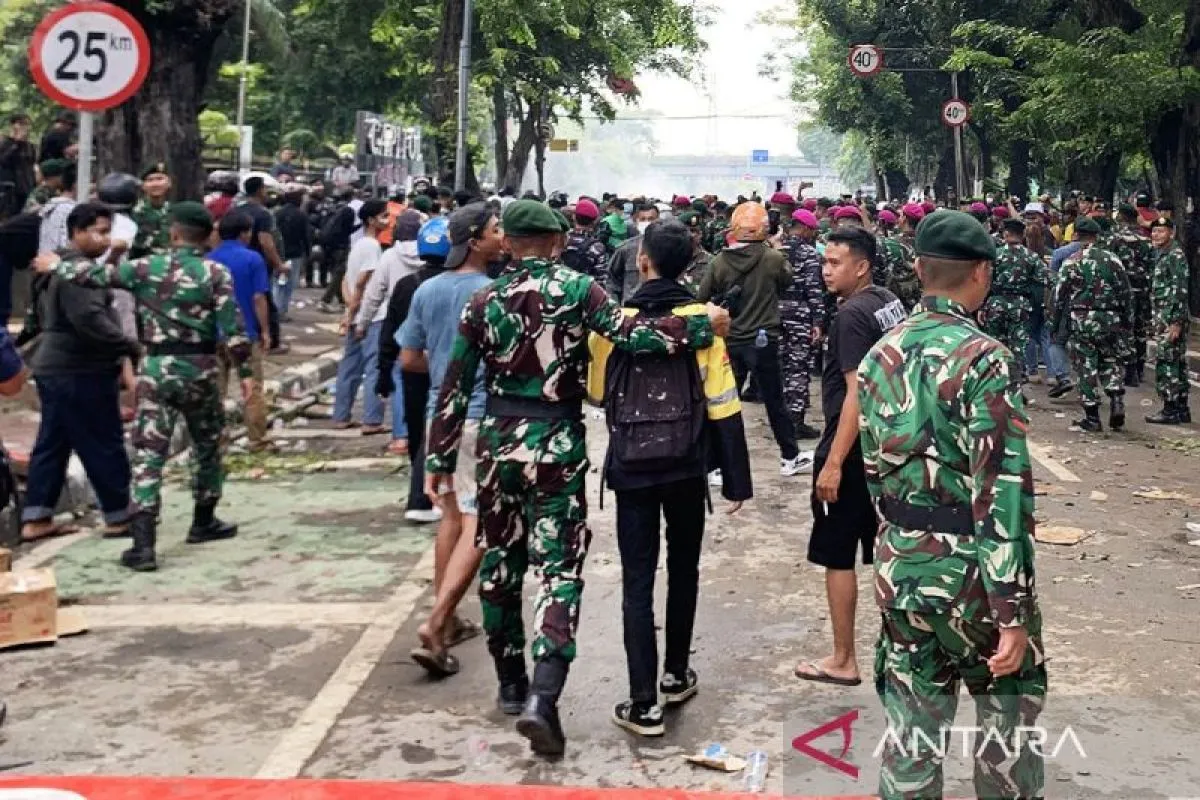 Setelah dialog selesai, ratusan personel TNI mengawal demonstran mundur dan berjalan ke arah jalan layang Senen.