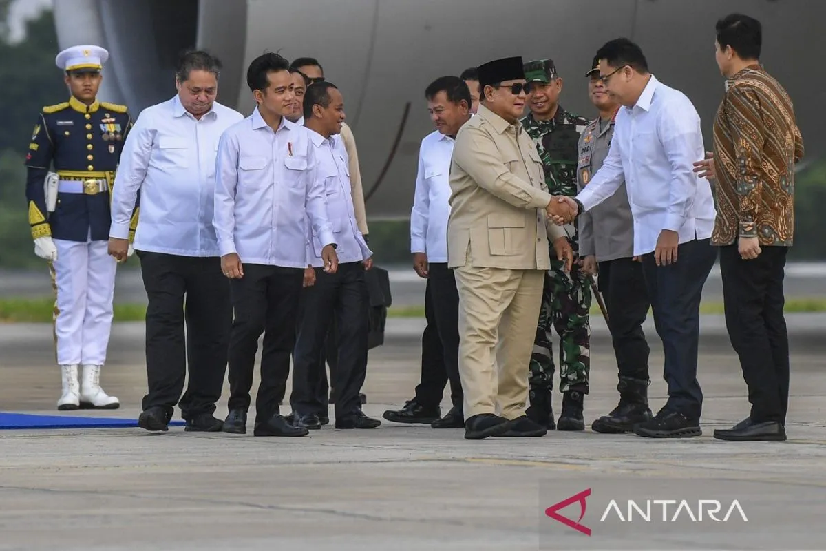 Tampak menyambut kedatangan Presiden di Lanud Halim Perdanakusuma, Jakarta, antara lain Wakil Presiden RI Gibran Rakabuming Raka, Menteri Koordinator Bidang Perekonomian Airlangga Hartarto, Menteri Sekretaris Negara Prasetyo Hadi, Menteri ESDM Bahlil Lahadalia, Menteri Pemuda dan Olahraga Erick Thohir, Wakil Menteri Komunikasi dan Digital Angga Raka Prabowo, Kepala BIN Muhammad Herindra, Panglima TNI Jenderal Agus Subiyanto, dan Wakapolri Komjen Polisi Dedi Prasetyo.