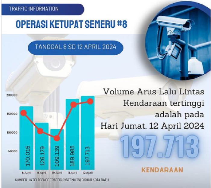Berdasarkan informasi dari Intellegent Traffic System (ITS) Dinas Perhubungan Kota Batu, volume kendaraan tertinggi terjadi pada 12 April 2024 sebanyak 197.713 kendaraan.
