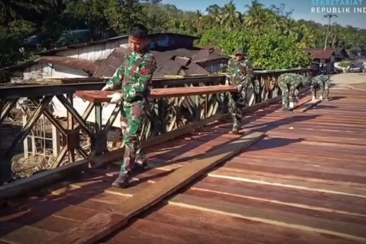 Dalam video yang turut diunggah di akun Instagram Sekretariat Kabinet itu, tampak sejumlah prajurit TNI AD bahu membahu membangun jembatan Bailey di Tapanuli Tengah.