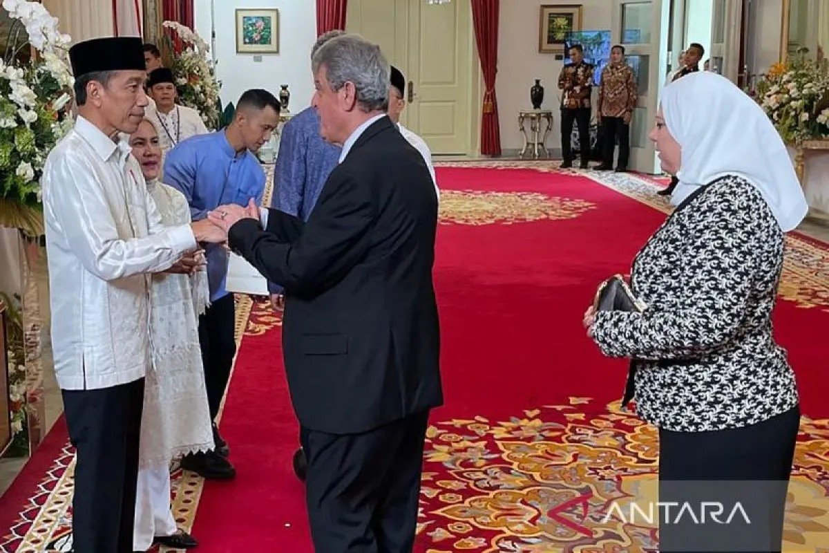 “Hari ini, setelah bulan suci Ramadhan, kita merayakan di istana ini bersama Yang Terhormat (Presiden Joko Widodo). Saya hadir untuk mengucapkan Selamat Idul Fitri dan mendoakan seluruh bangsa Indonesia kebahagiaan dan kesejahteraan,” tuturnya.(ant)