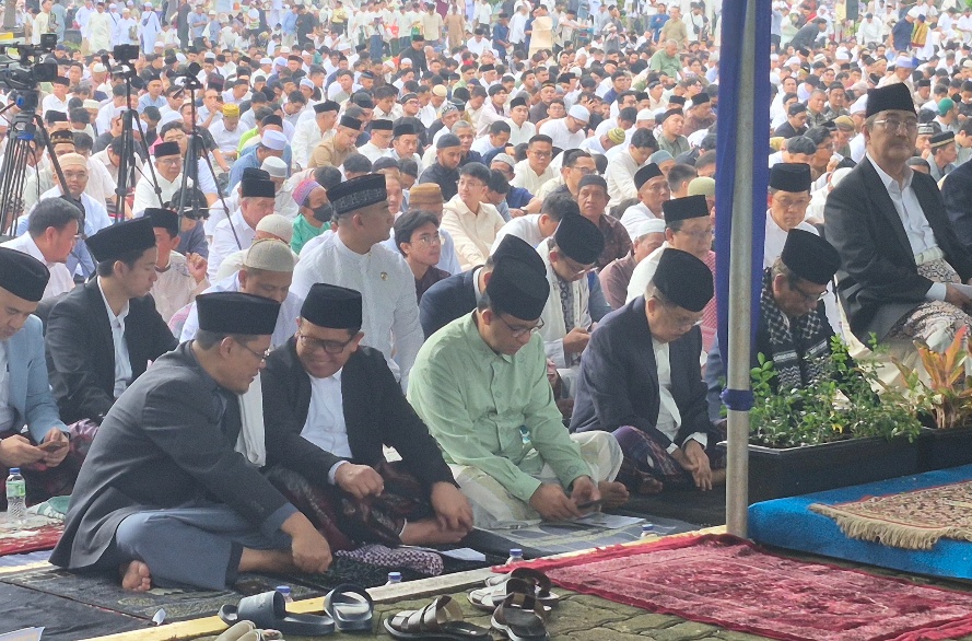 Tampak, Wakil Presiden ke-10 dan ke-12 Jusuf Kalla, Mantan Menteri Koordinator Politik, Hukum, dan Keamanan (Menkopolhukam) Mahfud MD dan juga Mantan Menteri Negara Pemuda dan Olahraga Adhyaksa Dault turut hadir shalat Ied.