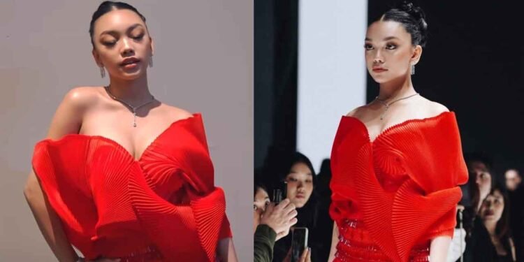 Naura Ayu semula terlihat lancar berjalan di runway mengenakan busana berwarna merah menyala karya desainer Ernesto Abram.