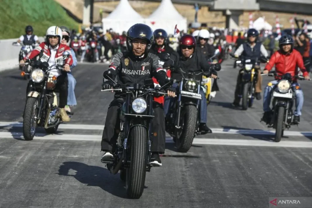 PENAJAM PASER UTARA, Kalimantan Timur – Presiden Joko Widodo mengendarai sepeda motor bersama sejumlah selebritas, seperti Raffi Ahmad hingga Menteri PUPR Basuki Hadimuljono menyusuri jalan tol menuju Ibu Kota Nusantara di Penajam Paser Utara, Kalimantan Timur, Minggu.
