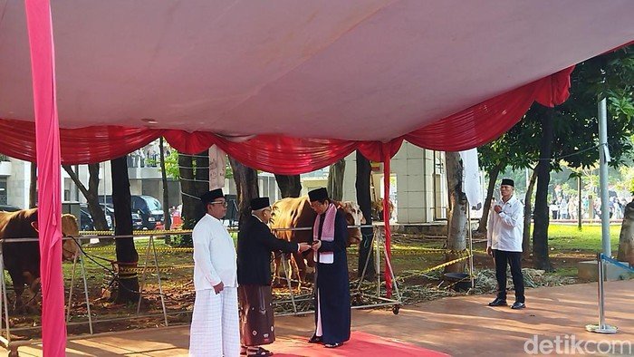 Penyerahan hewan kurban ini diserahkan secara simbolis oleh Ma’ruf Amin dengan memberikan tali tambang yang mengikat di badan sapi kepada Nasaruddin Umar.